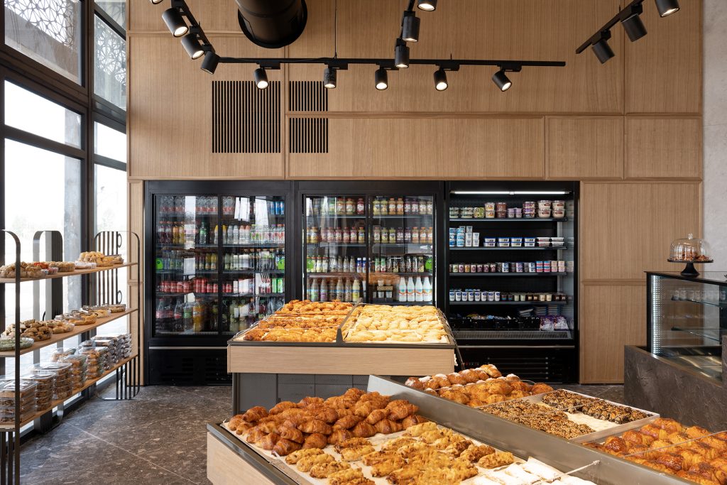 We designed Rifa Bakery to be a breath of fresh air. The space is flooded with natural light thanks to the huge windows, highlighting the mix of raw concrete ceilings and warm wood paneling. The star of the show is the custom dark stone counter, which adds a cool, modern touch to the cozy atmosphere. It’s the perfect spot to enjoy the aroma of fresh baking.